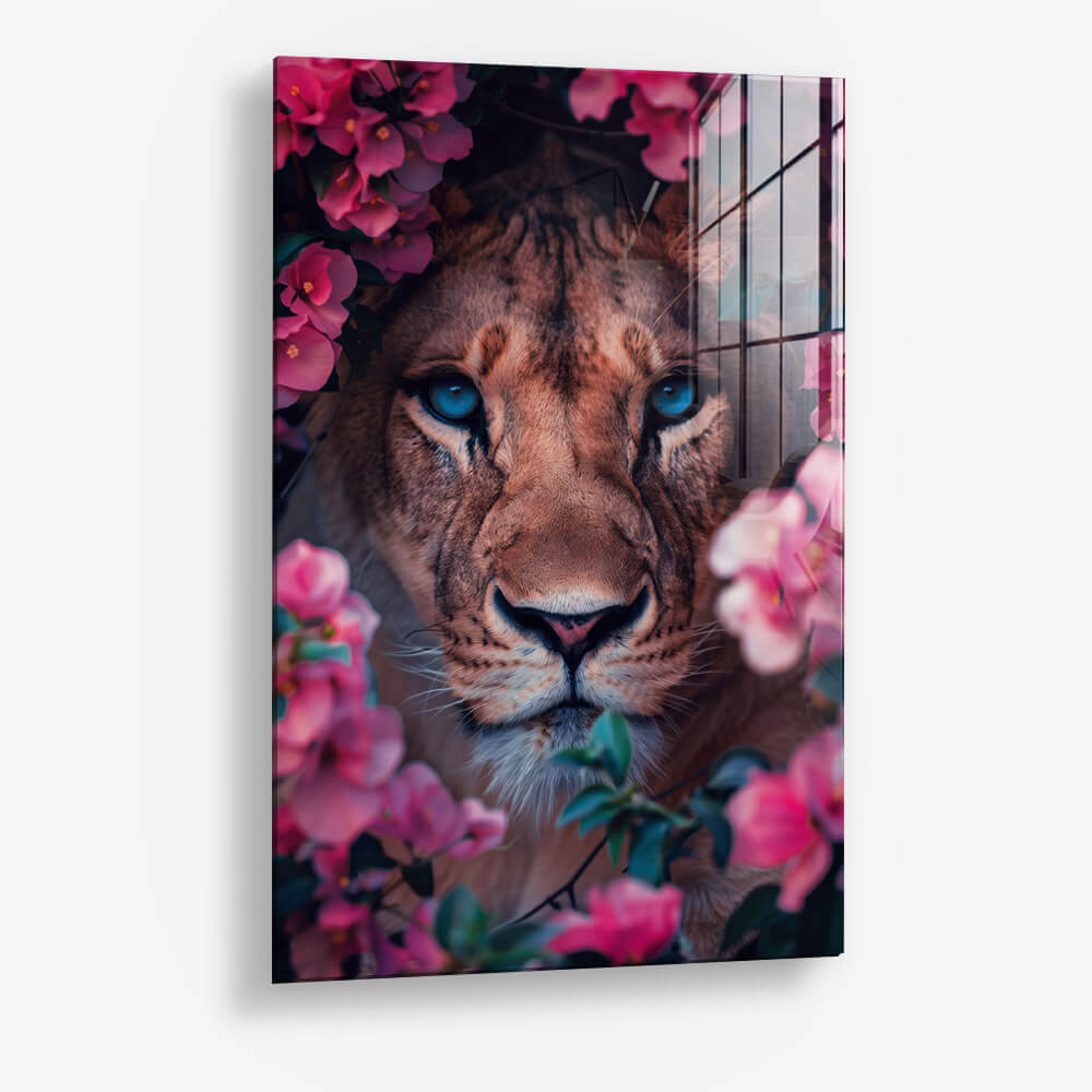 Lioness in Flowers – Glass // 60x90 cm // Mit Rahmen (schwarz)